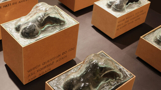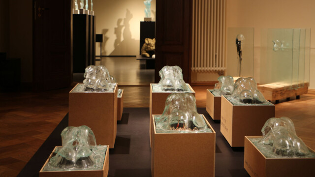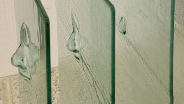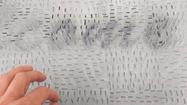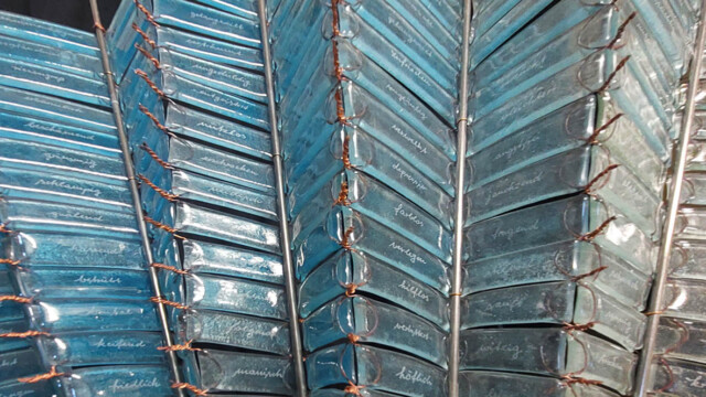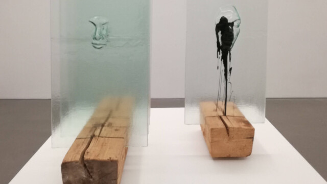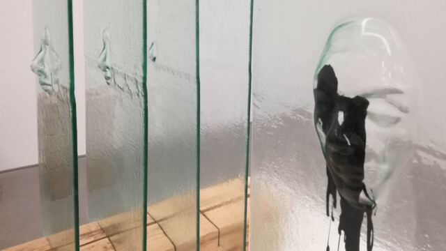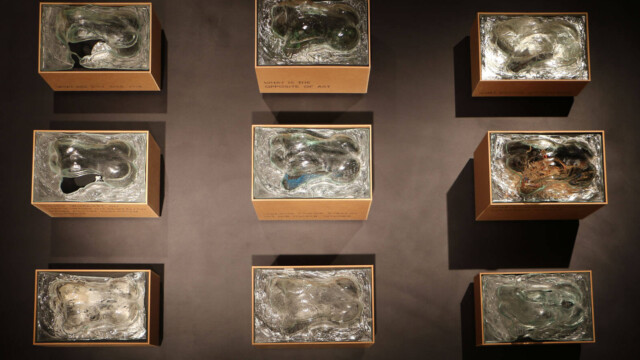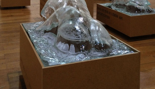 2018/2022 (ständige Erweiterung) 9-teilig, Glas in Form geschmolzen, MDF Boxen Boxen je 38 cm x25 cm, Höhen variabel"Grenzerfahrung"