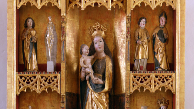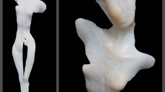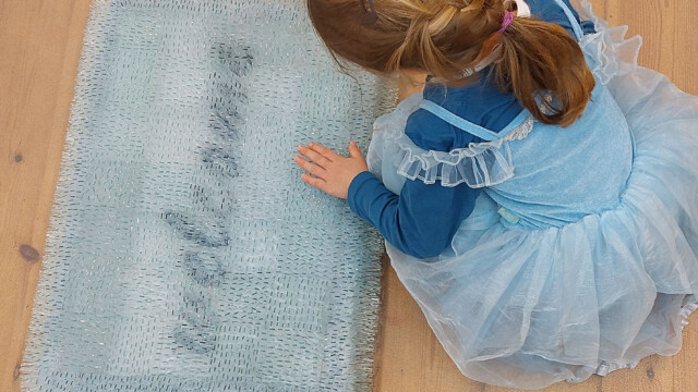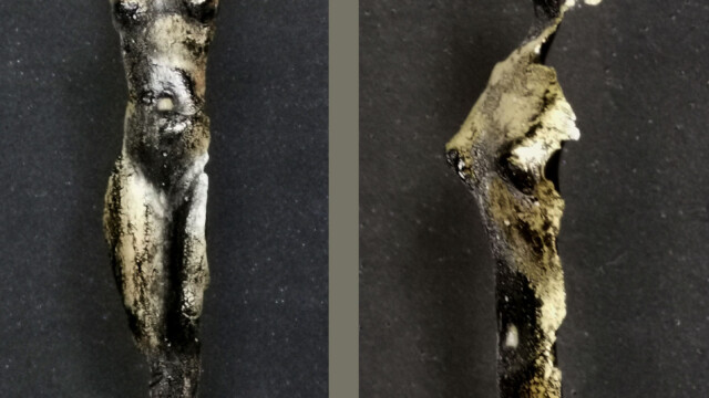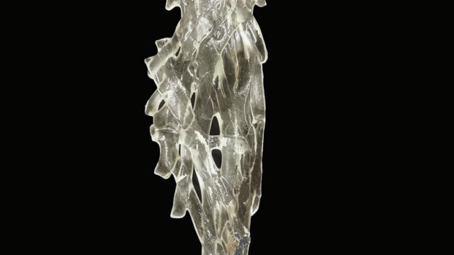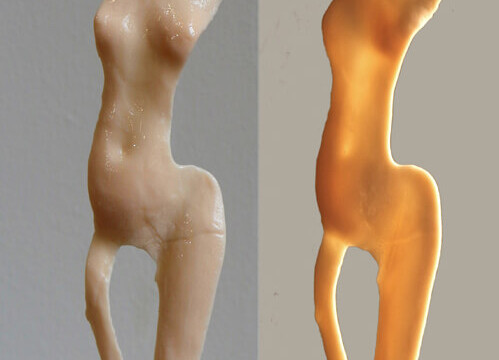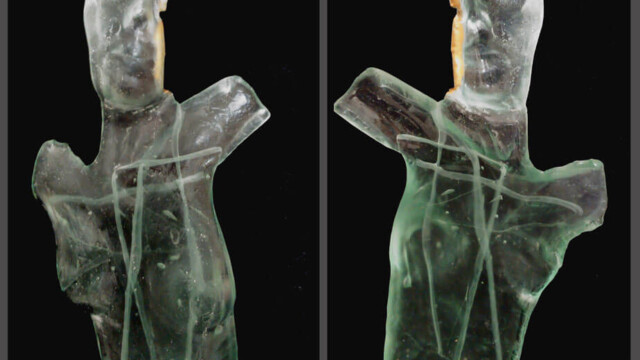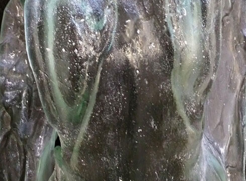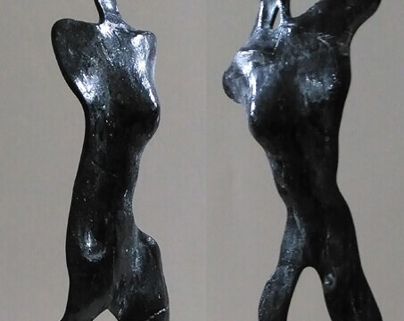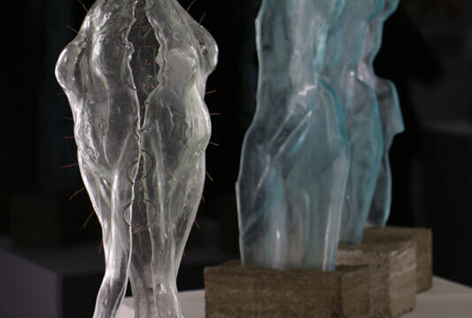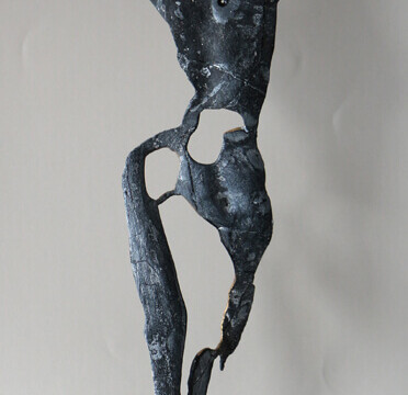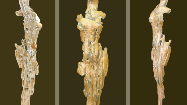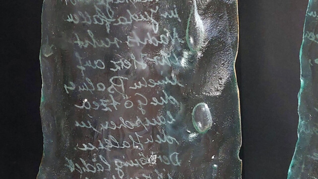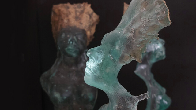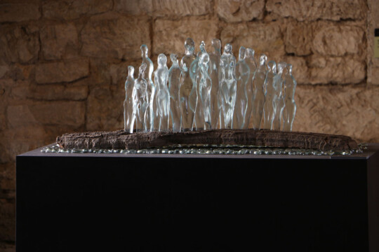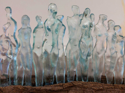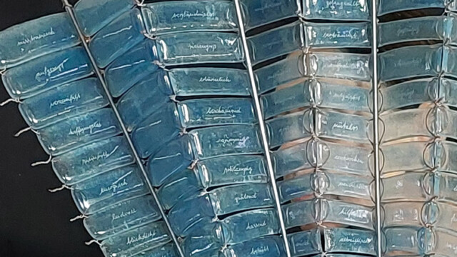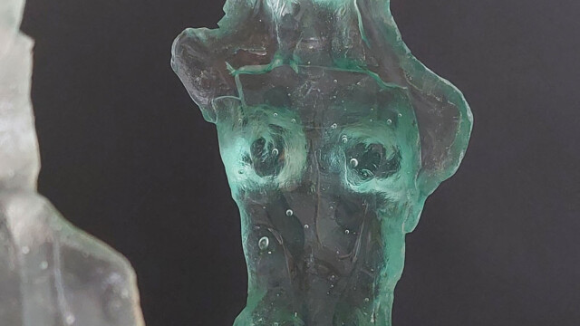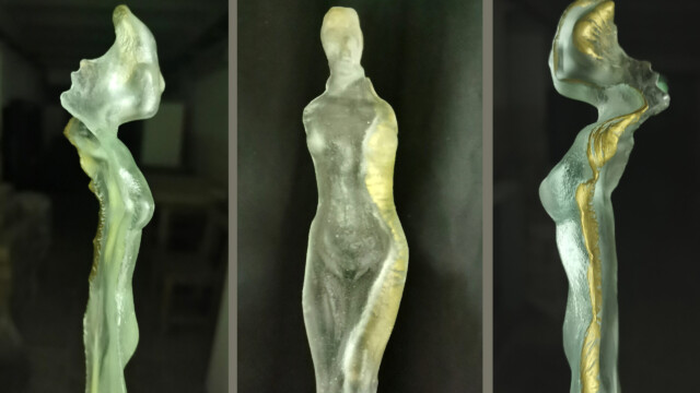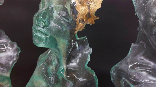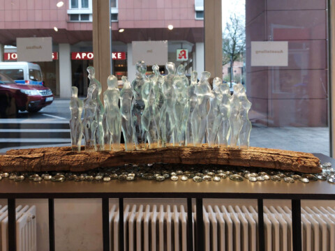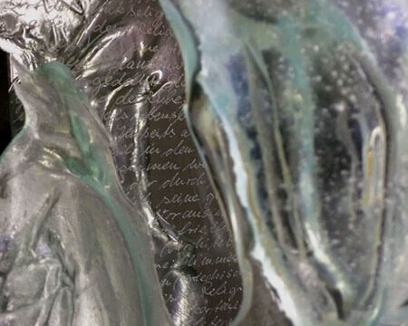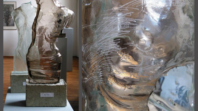2023 Glas in Form geschmolzen Treasuregold, graviert mit Texten von Else Lasker-Schüler Figur mit Betonsockel ca. 70 cm hoch"kleine Figurinen"