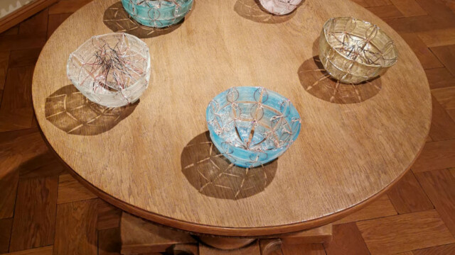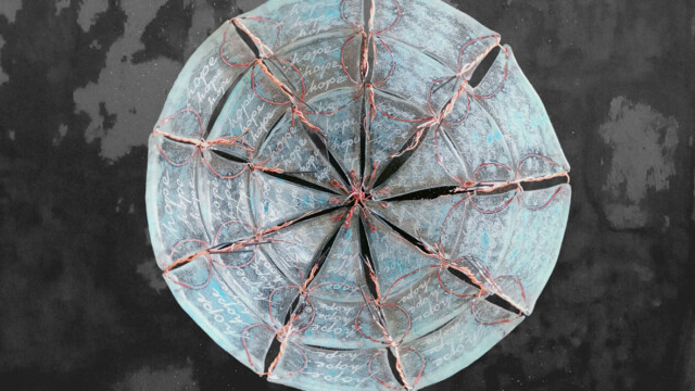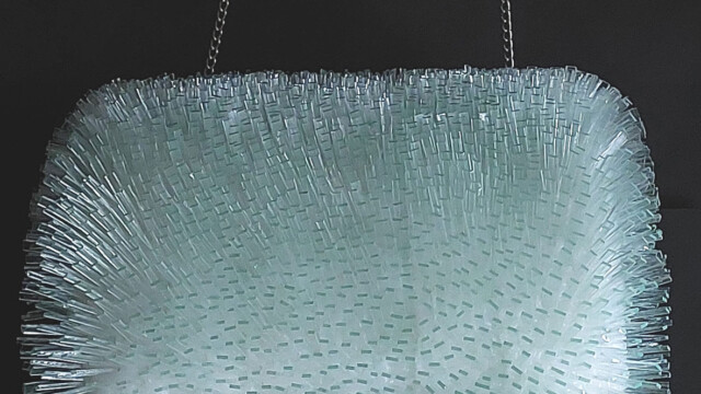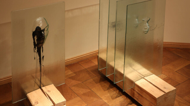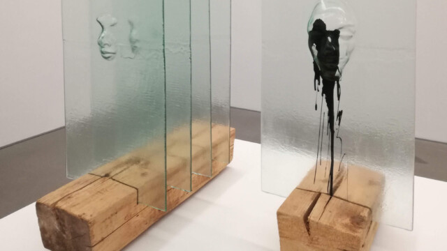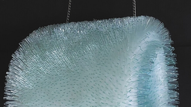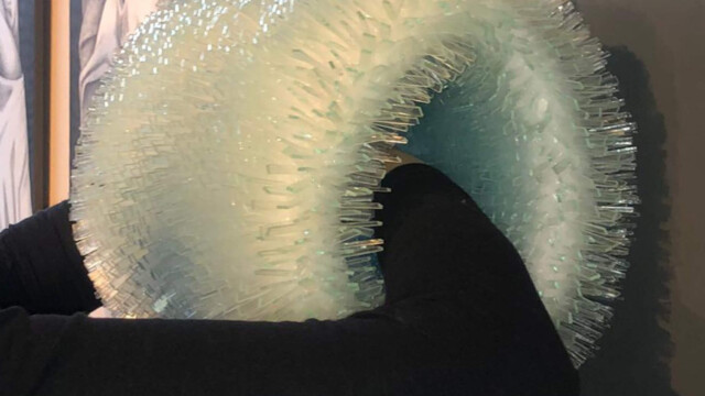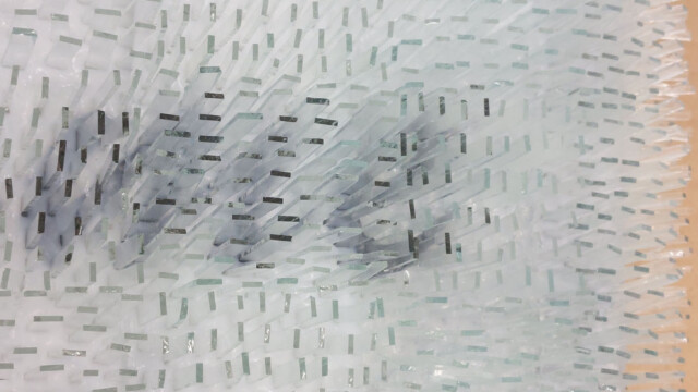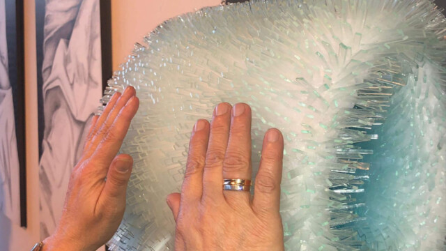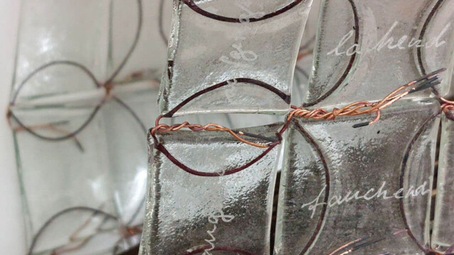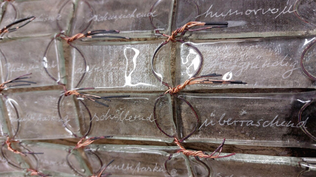Glasobjekt, Maße 42x 32x26 cm an bemalter MDF Platte 50x200cm gehangen
